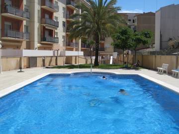 AT144 Nova Torredembarra: Zwei-Zimmer-Wohnung in der Wohnanlage 'Nova Torredembarra', in unmittelbarer Nähe zum Strand 'Els Muntanyans' in Torredembarra. Die Wohnung ist sehr gut ausgestattet mit Klimaanlage/Wärmepumpe in allen Räumen, Geschirrspüler und Glaskeramik-Kochfeld. Die Wohnung verfügt über ein Ess-/Wohnzimmer mit Terrasse (ausgestattet mit Gartenmöbeln), eine Küche, ein Doppelschlafzimmer mit eigenem Bad, ein Zweibettzimmer und ein zweites Bad. Im Mietpreis enthalten ist auch ein privater Parkplatz. Genießen Sie die schöne Gemeinschaftsanlage mit einem großen Garten mit Rasen, einem Schwimmbad (geöffnet von Mai bis Oktober) und einem Kinderspielplatz. Gruppenbuchungen von jungen Leuten zwischen 16 und 26 Jahren werden nicht akzeptiert....